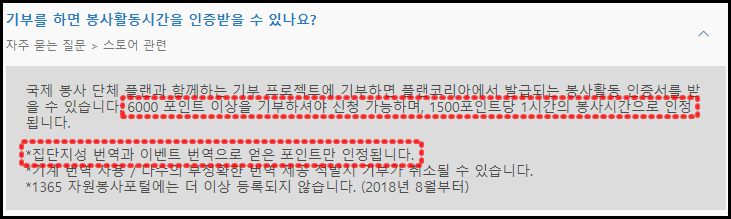 플리토에서 모은 포인트는 스토어에서 기부를 할 수 있습니다. 1365와는 연계가 되지 않고 기부활동 주최 측인 국제 봉사활동 단체인 플랜코리아에서 인증서를 발급해 준다고 합니다. 6천 포인트 이상 기부해야 하고 1500 포인트당 한 시간의 봉사시간이 인정된다고 합니다.